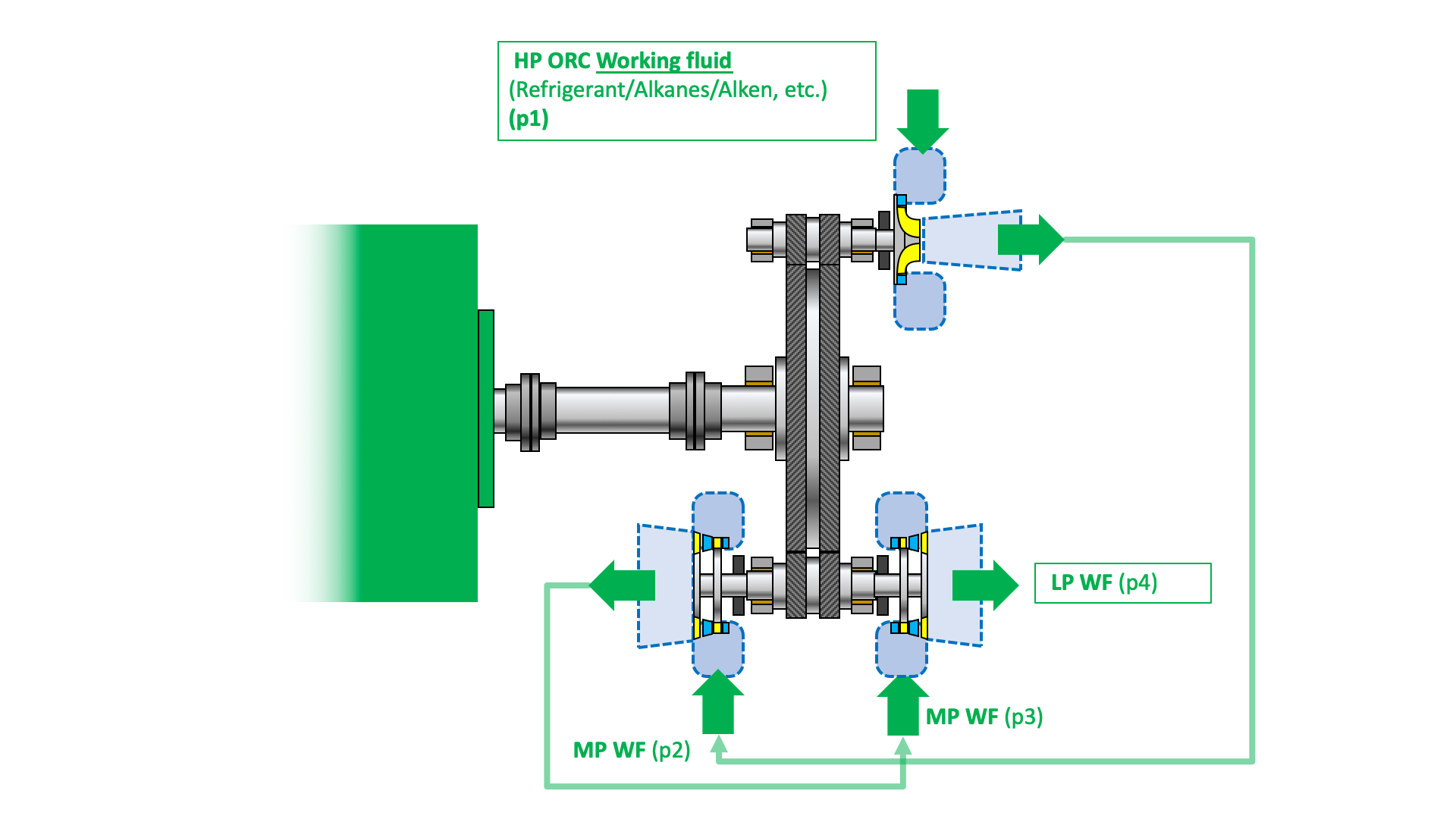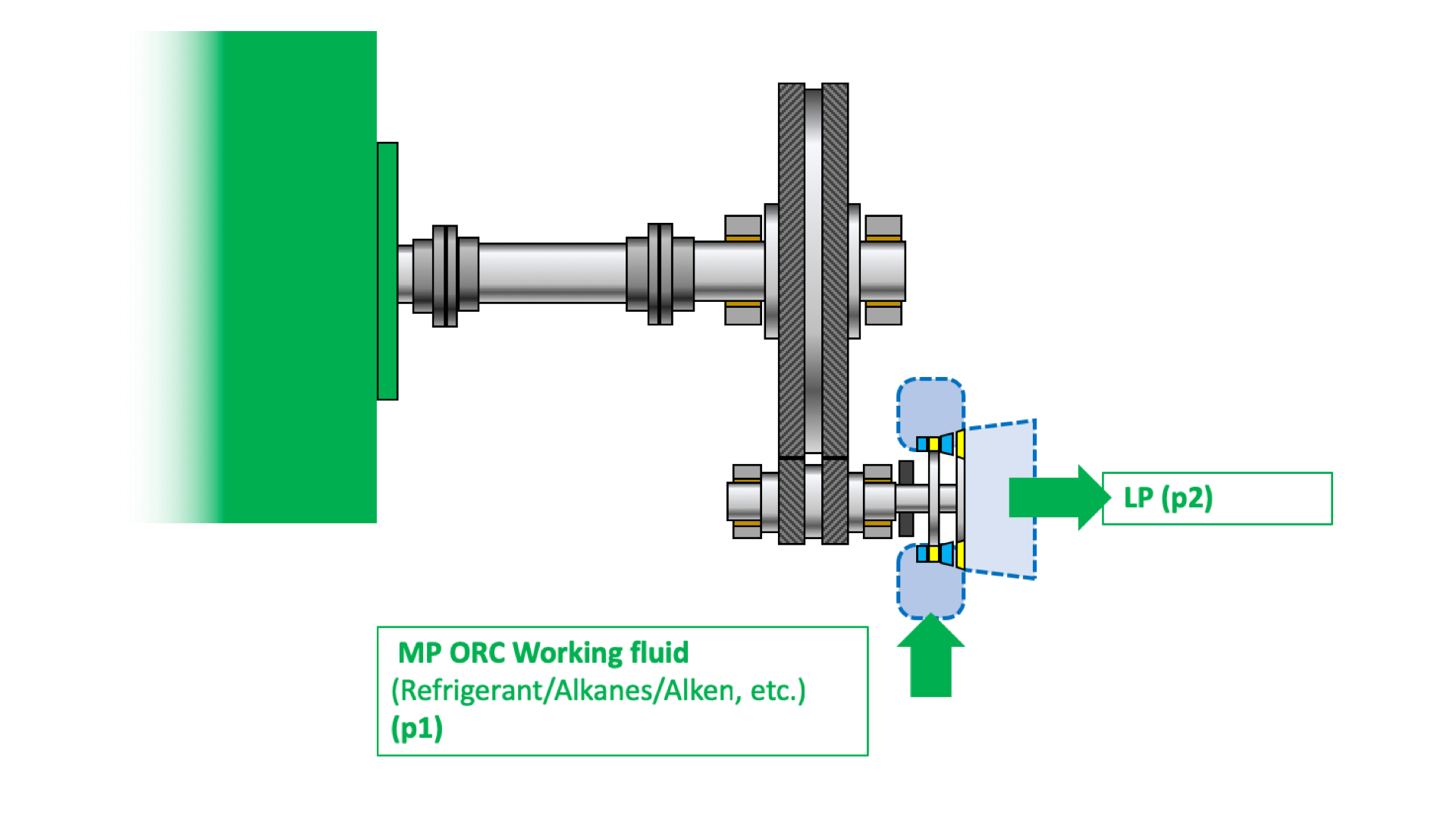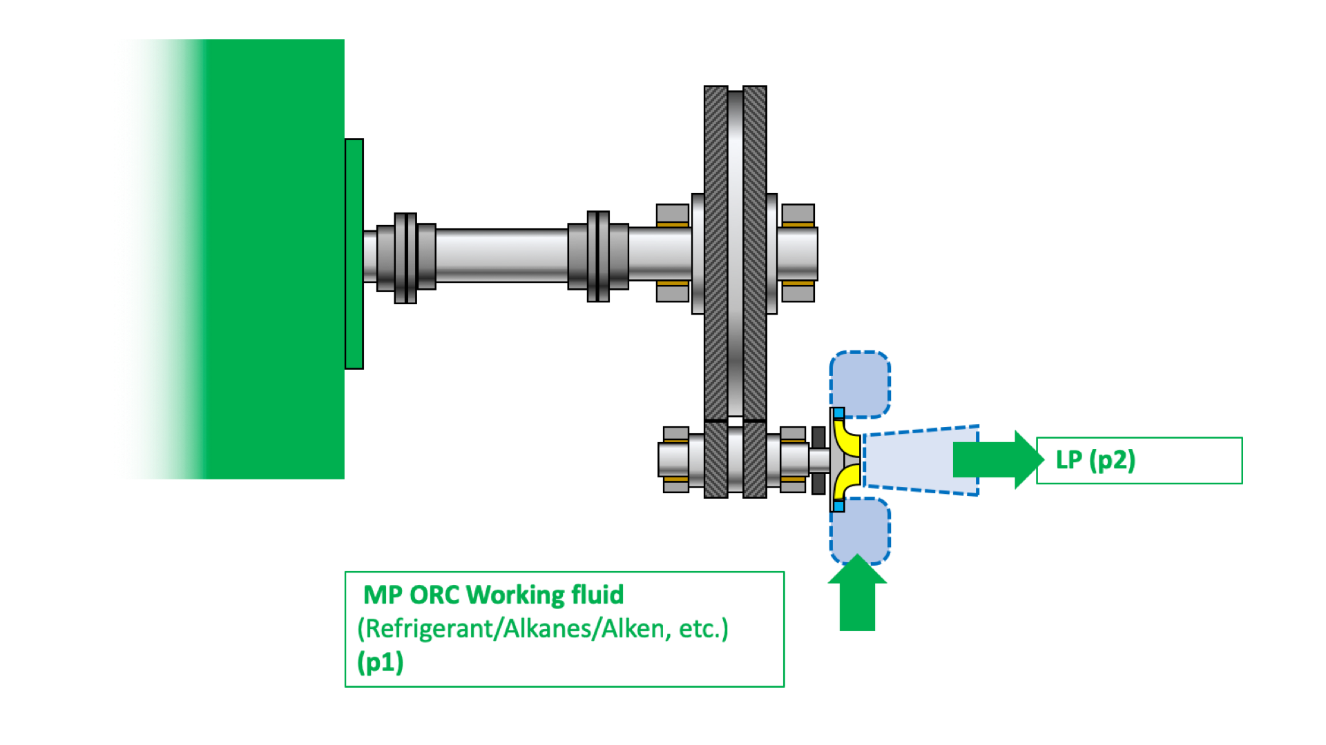 Overhung cantilevered single shaft architecture for simple, for an easily maintenable yet highly efficient expander. From 250 kW up to 2 MW. Perfect for low volume flow and low to medium enthalpy drop. Ideally suited for refrigerant such as R1233zd, R1234ye, pentane, butane.