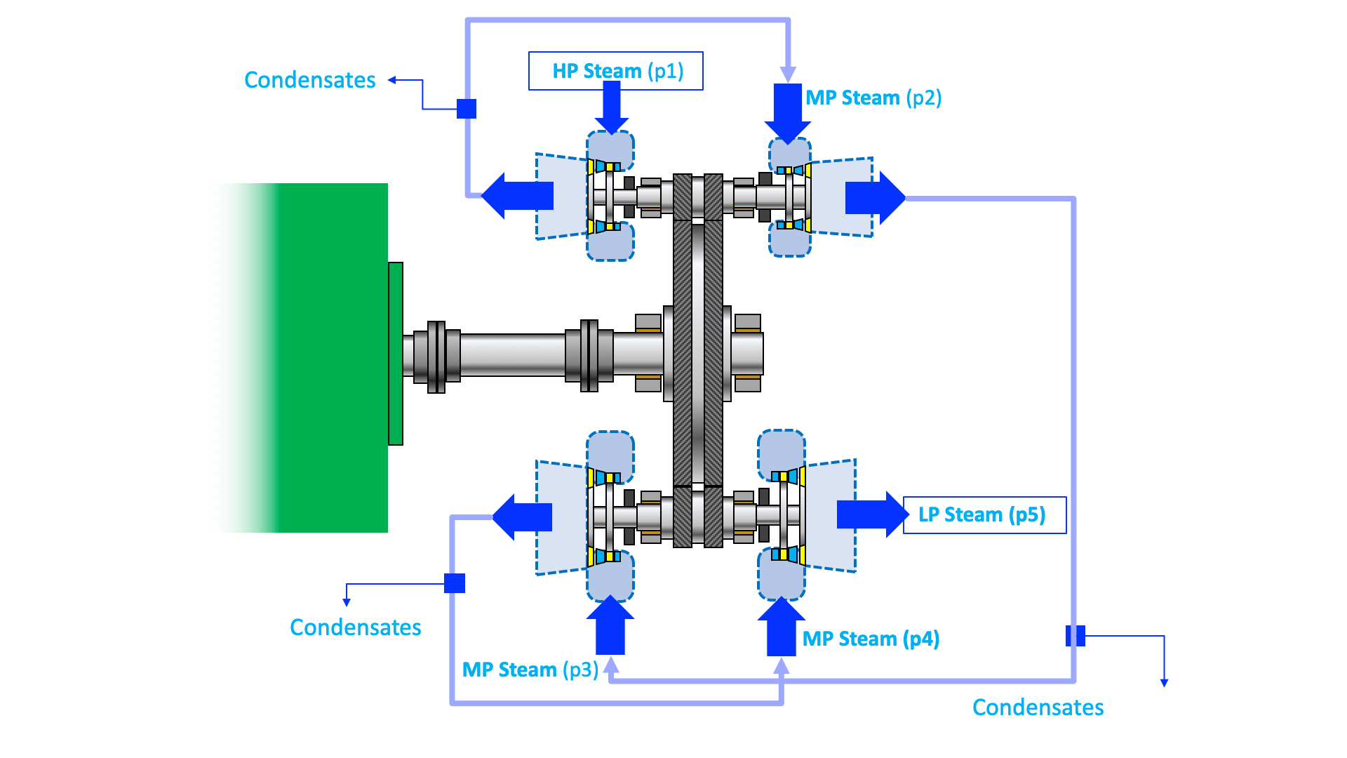 Up to 4 turbines for the maximum expansion ratio. Use high speed shaft for HP->MP expansion, low speed shaft for MP->LP expansion (allowing turbines rotational speed to be the most appropriate).